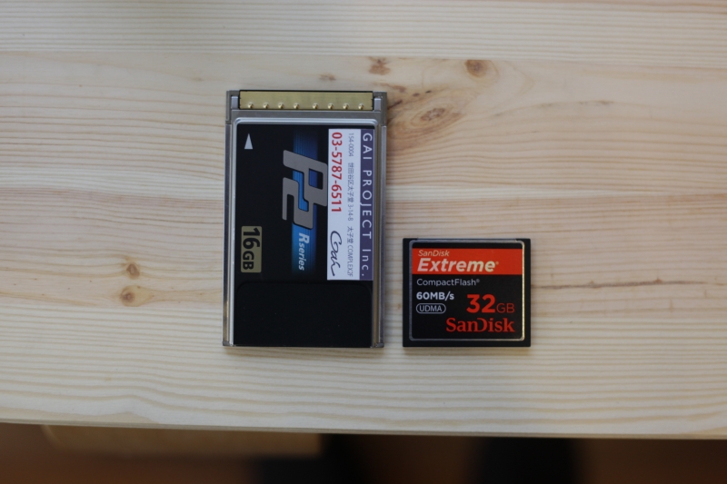 写真は、P2メモリーカード(Panasonic)とコンパトフラッシュです。P2形式は放送業界で信頼度が高く、前回の北京オリンピックでは、このカードを使用したハイビジョン撮影が威力を発揮しておりました。また、ソニー製のHDVカメラや、EOSムービーなどは主にコンパクトフラッシュを使用します。こちらは一般の方でも馴染みのあるものかと思われます。
