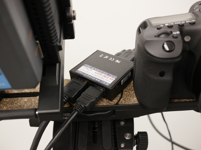 現場ではモニターアウトは必須だ。しかしながらEOSはHDMI一系統しか出力ができない。またHDMI出力時はカメラ本体のライブビューには何も映らなくなってしまう。そこでHDMIを分岐する必要が出てくる。HDMIスプリッターをいろいろ探した結果、弊社では最もコンパクトなテックのHDMI分配器を使用した。こちらで、カメラマン用のモニターと、クライアント用のモニターに出力している。ネックは分配機の電源だ。幸い、今回はほとんどが室内ロケだったため、電源は確保できたが、その都度電源を確保しなければならず、これが結構な手間である。プロ機材ドットコムではDC対応のHDMIスプリッターを発売する予定があるらしいので、注目している。