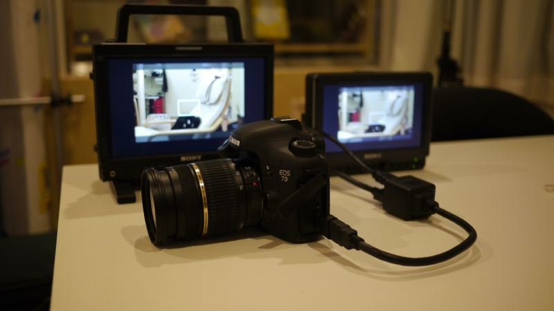 さあ、実際に電源が必要ないHDMI分配機であれば、使用用途は一気に広がる。はやる気持ちを胸に、さっそく弊社で機材をセッティング。まずは一眼ムービーとしてメインで使用しているEOS 7Dから。モニターはSONYのLMD-940と、LPM-770BPを用意、その二つのモニターに例の分配機をかまして、7DのHDMIにミニ変換を経由し装着。ライブビューオン!おお!!映った。2つとも鮮明だ。一眼ムービーでの外ロケの夜明けが来た!心が踊ったその直後、若干の違和感が…。あれ?なんかアスペクト比違ってる?スキャンは?モニタ側の設定をいじってみる。しかしなにも変化せず、4:3の映像で固定されてる。あれれ?おかしいな。そして画面右上の入力信号の表示に気づく。なるほど、入力は640x480で固定されているのか!そういうオチだったのか。あぁおしぃ!これがフルで信号でていればなぁ。ということで一旦は落胆する。